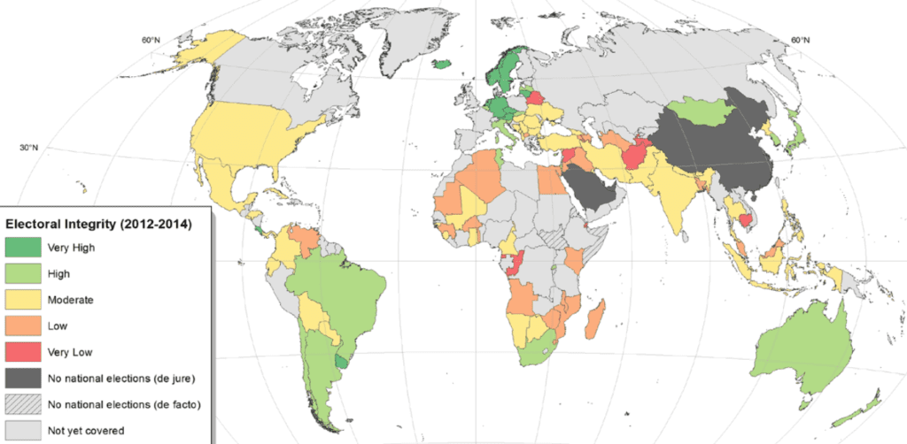 Here’s the international map from The Year in Elections, 2014, by Pippa Norris, Ferran Martinez i Coma, and Max Grömping: